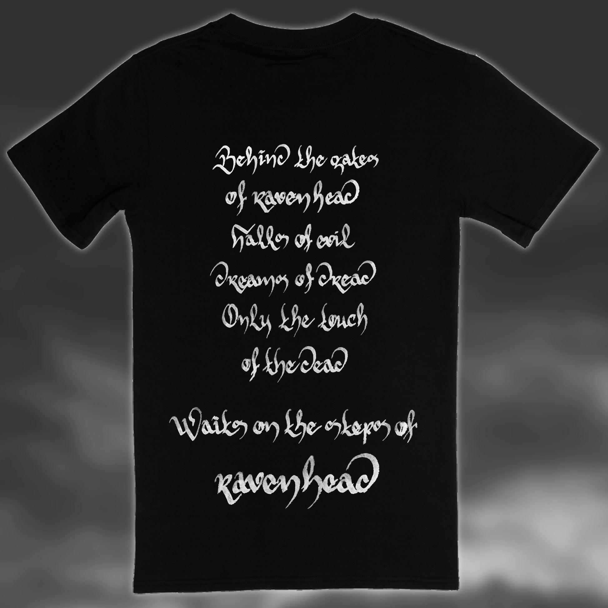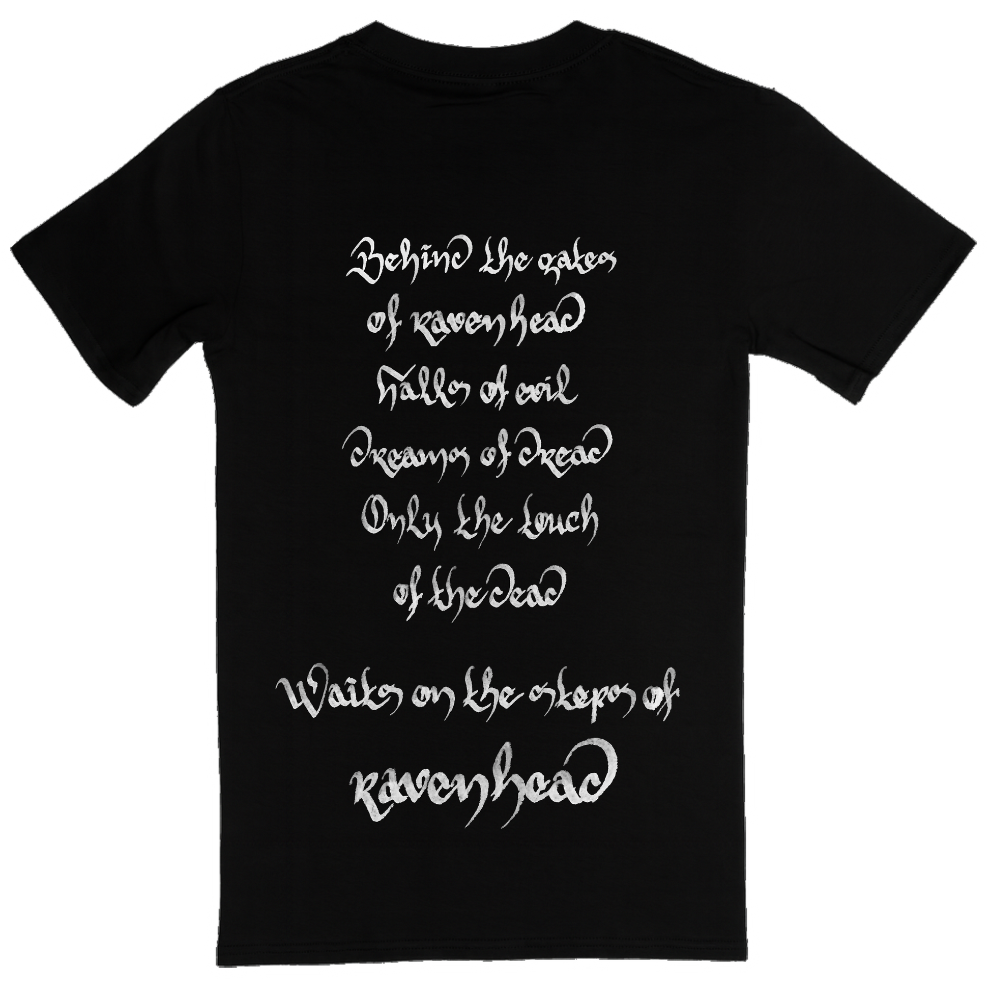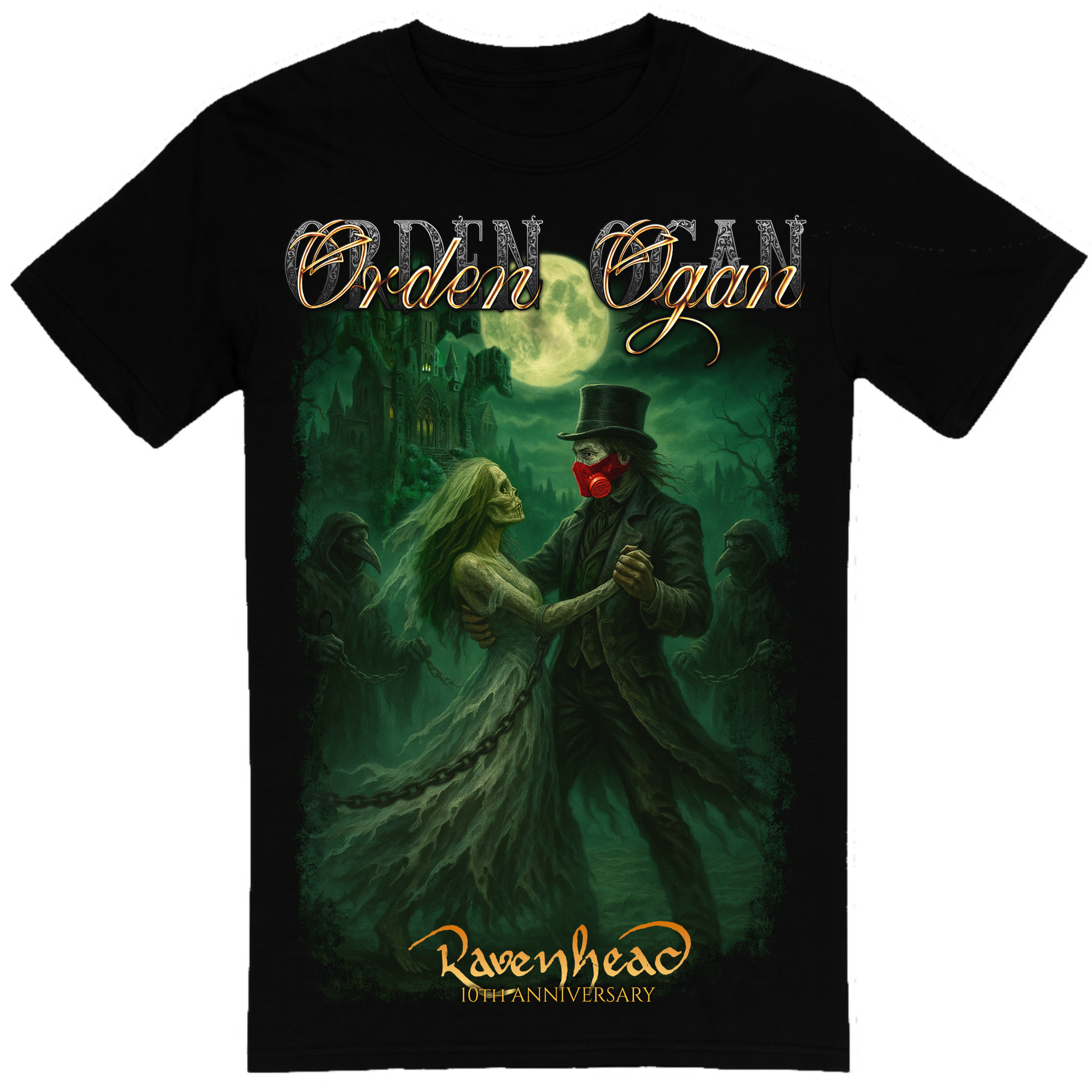 This Ravenhead Anniversary T-Shirt is original ORDEN OGAN merch sold exclusively at the Saloon Showdown IV in September 2025. The front features artwork of Alister Vale dancing with the woman of the lake featured in the Ravenhead artwork, while the back print features part of the lyrics to Ravenhead".