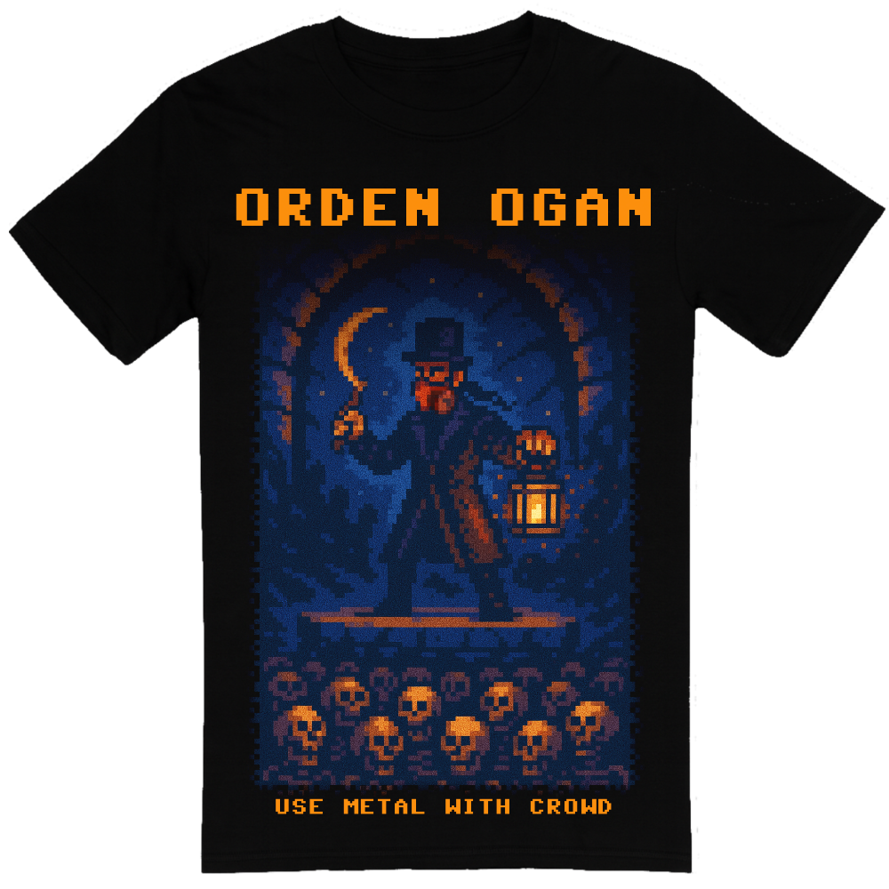 This Use Metal With Crowd Tour T-Shirt is original ORDEN OGAN merch sold exclusively on the tour with WIND ROSE (“Tourslayer 2025”). The front features Alister Vale in front of an audience of ghouls in a cute pixel art or 8-bit style, while the back print shows the complete tour dates.